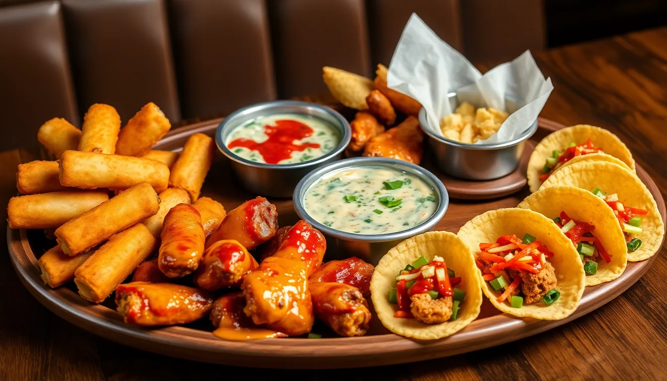 Mozzarella Sticks rank among the favorites, featuring crispy, golden-brown cheese served with marinara sauce for dipping. Spinach and Artichoke Dip presents a warm, creamy blend accompanied by tortilla chips, perfect for sharing. Buffalo Chicken Wings entice guests with their bold flavors and come in various spice levels to suit different palates. Classic Hummus offers a healthier alternative, served with pita chips and fresh vegetables for dipping.
